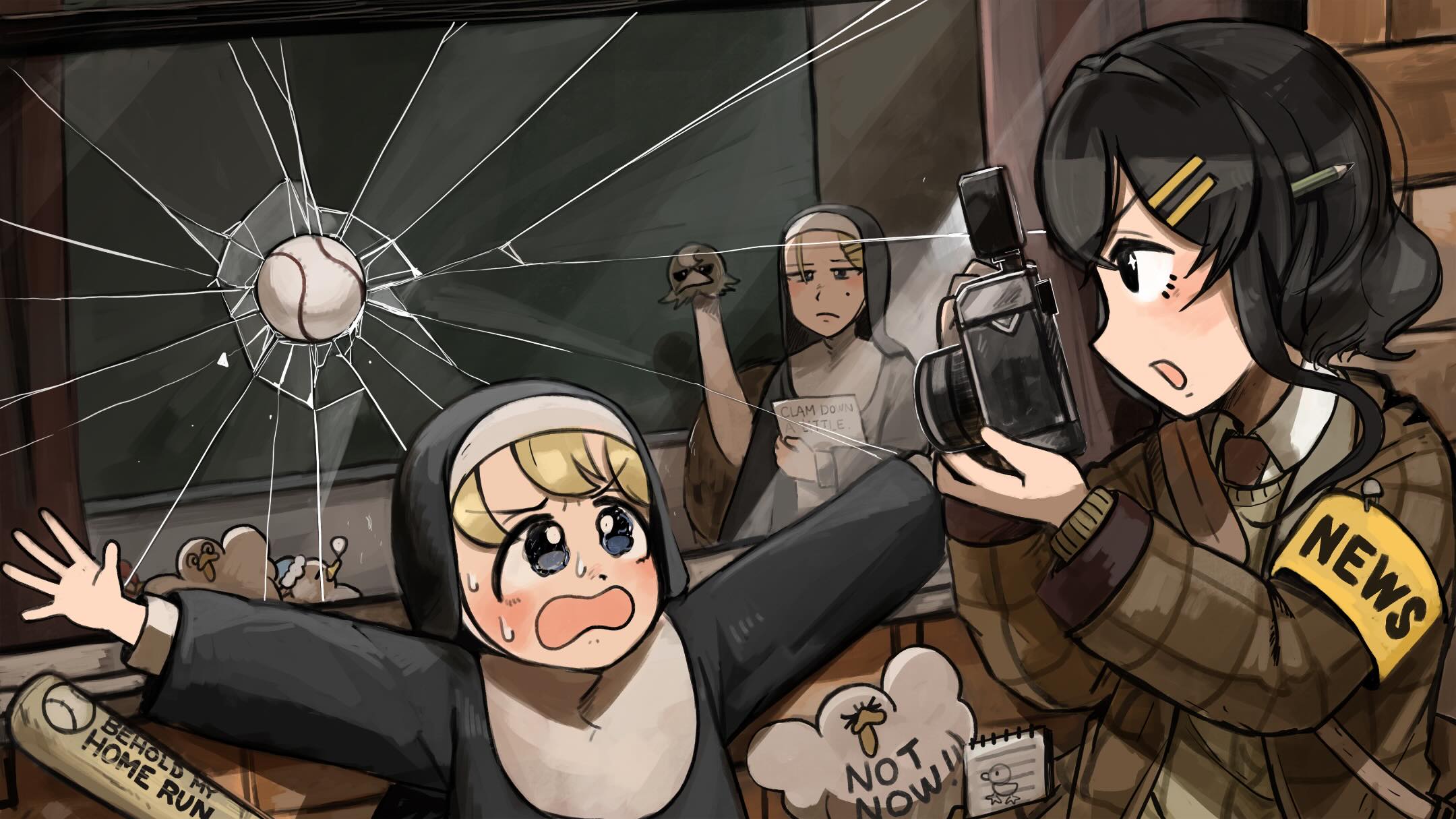 3girlsballbaseball (object)baseball batbirdblack hairblonde hairblue eyesbody writingbroken windowbrown coatcamerachalkboardchickencoatduckhair ornamenthairpinholdingholding cameramolemole on cheekmultiple girlsnunostrichshort hairtraditional nun