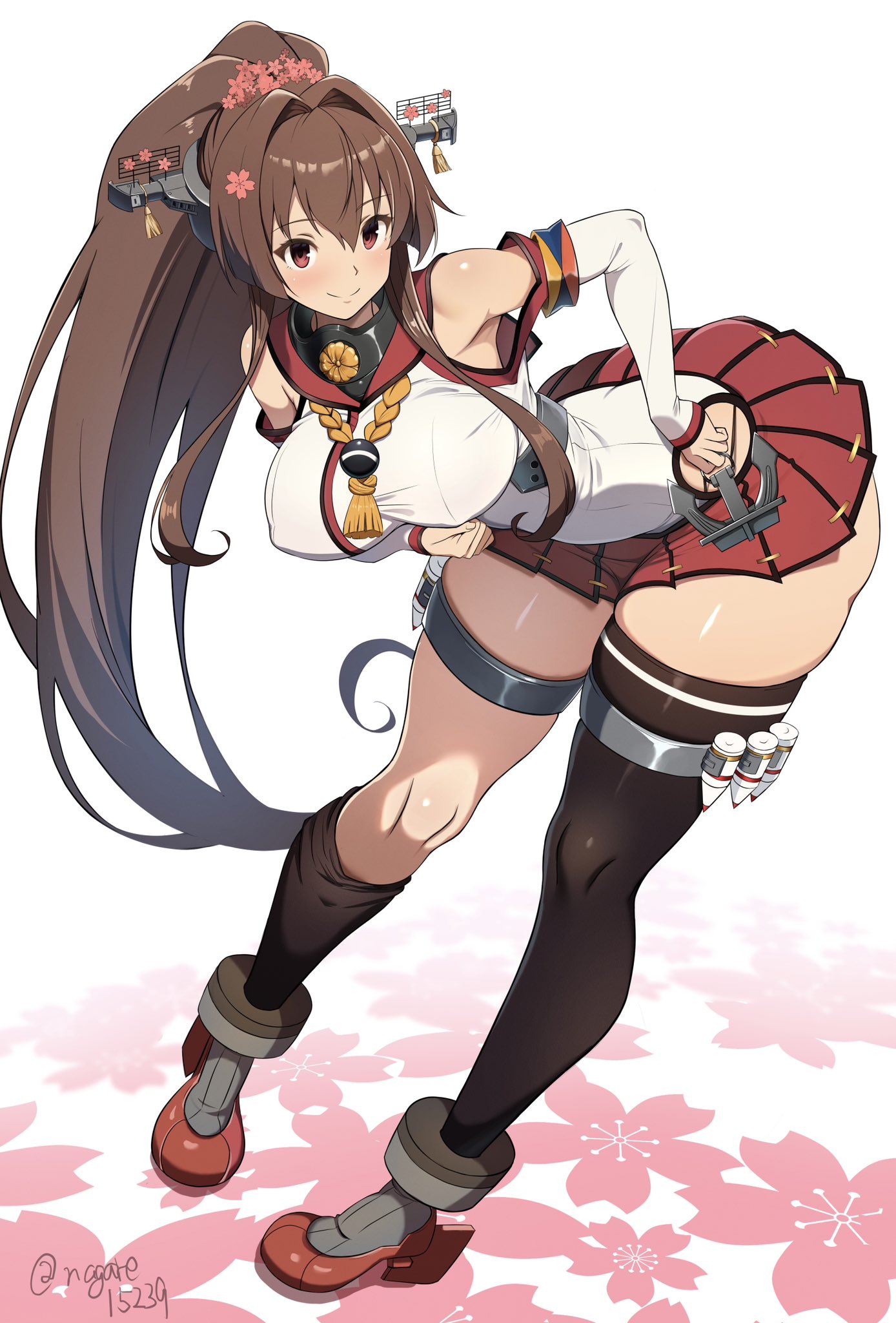 1girlbreastsbrown eyesbrown haircherry blossomsclothing cutoutdetached sleevesflowerhair flowerhair ornamentheadgearhip ventlarge breastsleaning forwardlong hairlooking at viewerpleated skirtponytailred sailor collarred skirtsailor collarsakuramonshirtshoulder cutoutside cutoutsingle thighhighskirtsolothick thighsthighhighsthighswhite shirtz flag
