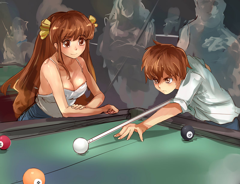 1boy1girlballbilliard ballbilliardsblushbreastsbrother and sisterbrown eyesbrown haircamisolecleavagecue stickhair ribbonlong hairribbonsiblingssmile