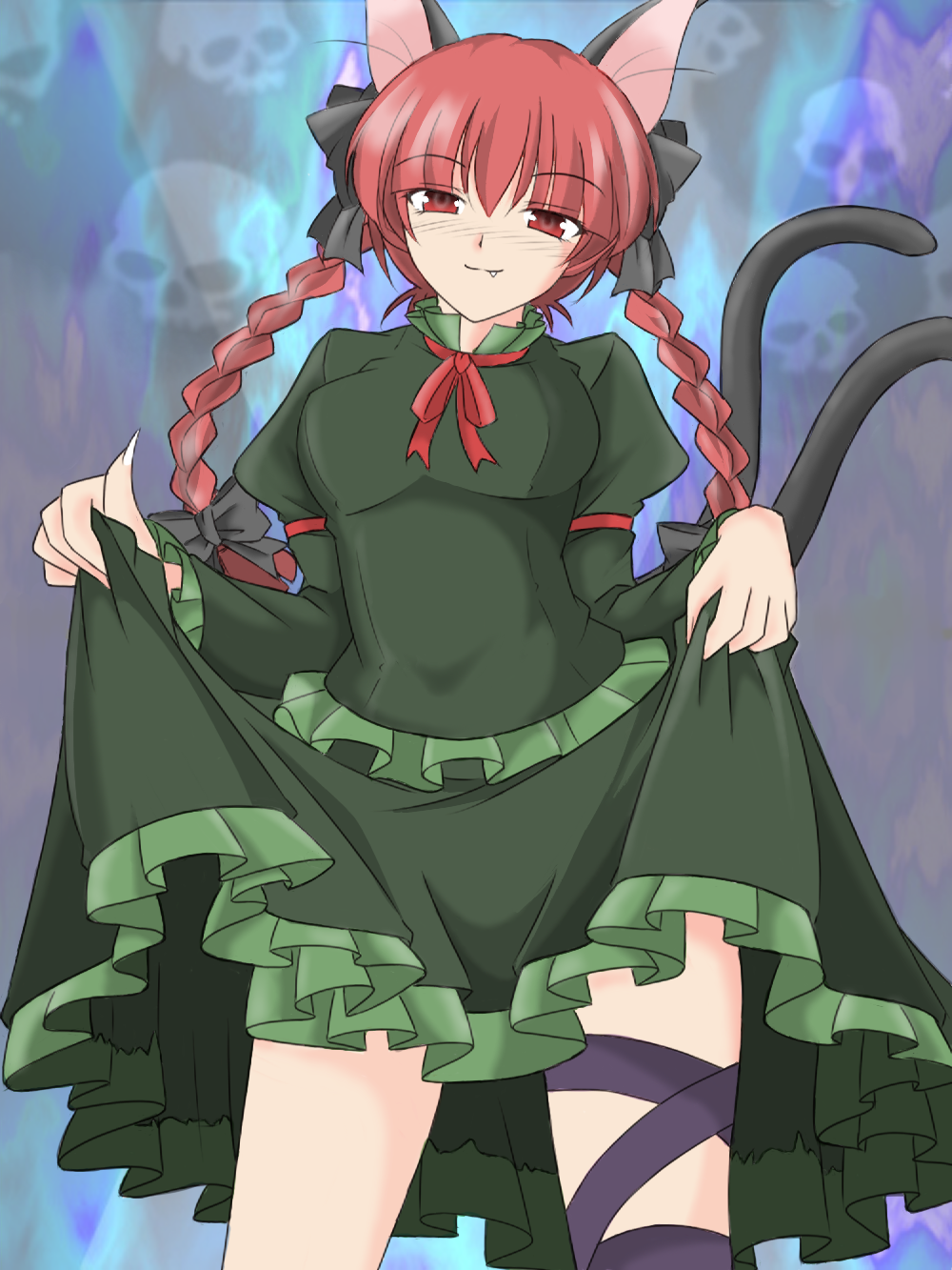 1girlanimal earsbraidcat earscat girlcat tailclothes liftfangfemale focusfingernailslong fingernailsmultiple tailsnail (hardware)red eyesred hairribbonskirtskirt liftskullsolotailtwin braids