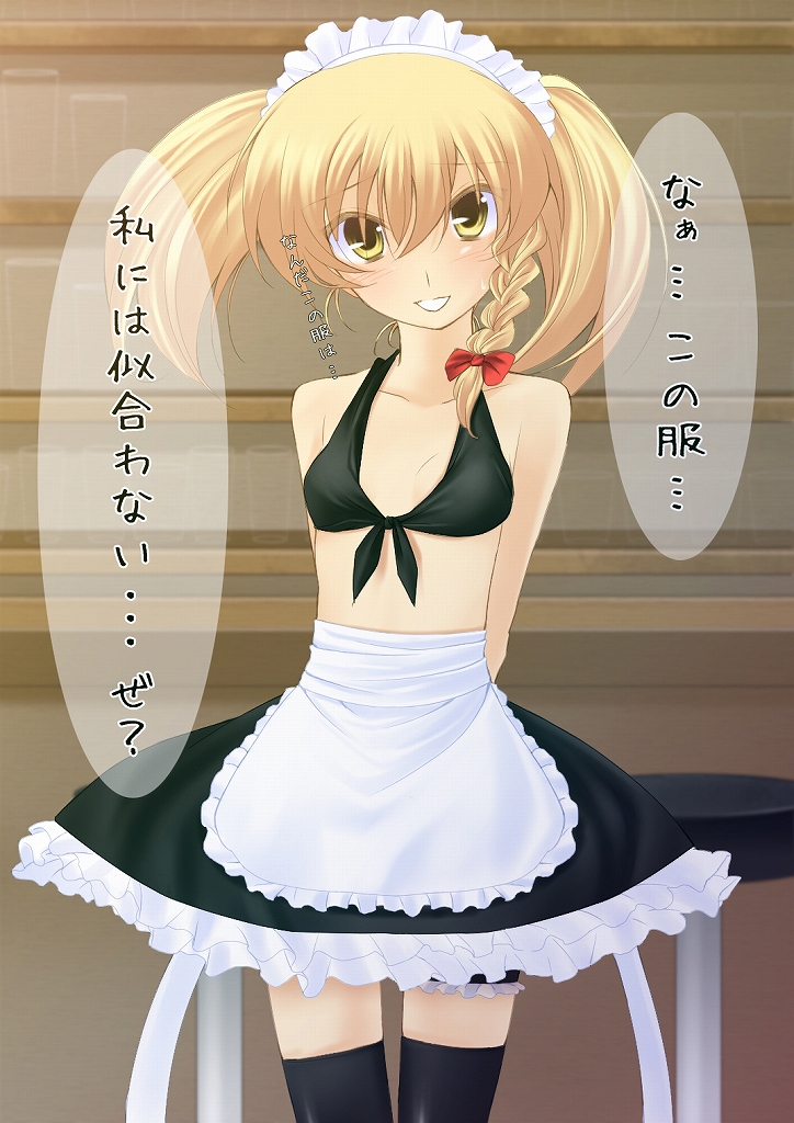 1girlalternate hairstyleapronbikinibikini top onlyblack bikiniblonde hairbraidfemale focusfrilled thigh strapfront-tie topmaidmaid apronmaid headdressshort hairsoloswimsuitthigh strapthighhighstwintailsyellow eyes