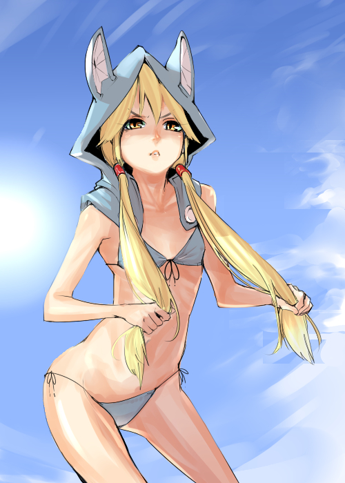 1girlanimal earsanimal hoodbikiniblonde hairblushbrown eyescat hooddayfemale focusflat chestfront-tie tophoodside-tie bikini bottomskinnysoloswimsuittwintails