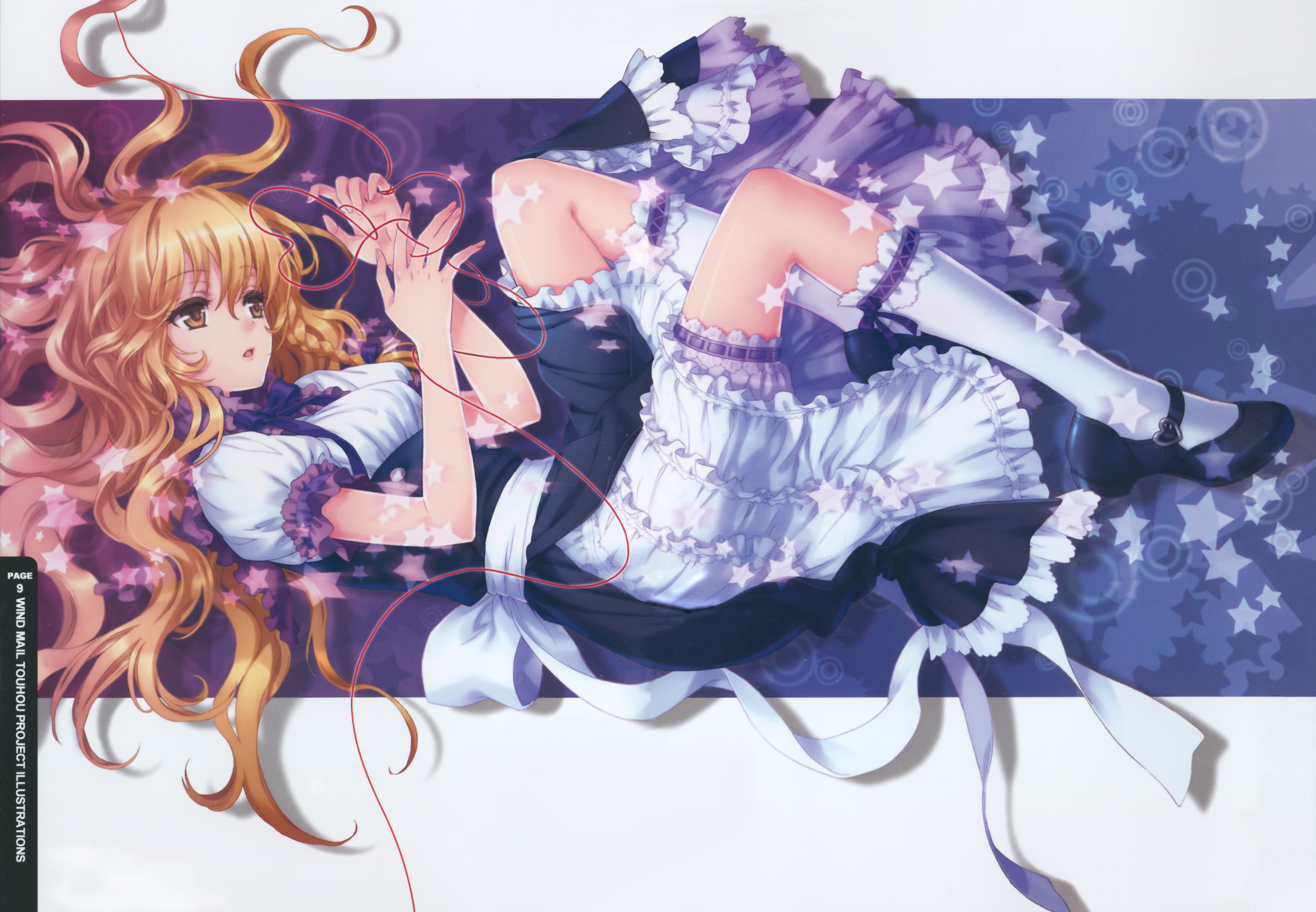 1girlblonde hairbloomersdressfemale focusfetal positionfrillsfull bodykneehighslyingmary janesplantar flexionshoessockssolostar (symbol)stringstring of fateunderwearyellow eyes