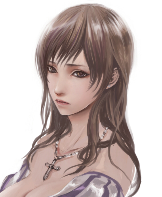 1girlbrown eyesbrown haircrossearringsfemale focusjewelrylong hairlooking at viewersimple backgroundsolowhite background