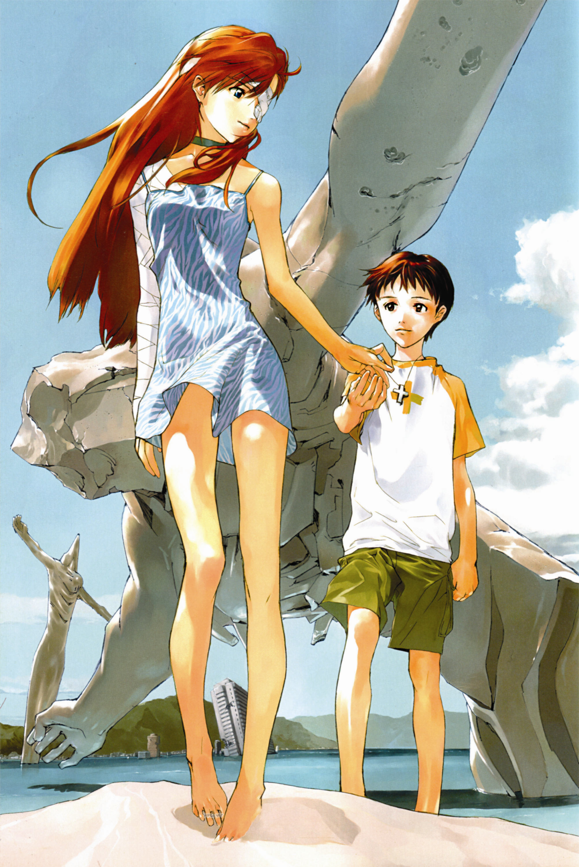 1990s (style)1boy1girlbad anatomybandagesbarefootblue eyesbrown eyesbrown hairchokercloudcoupledaydresseyepatchfeetheteroholding handsjewelrymoirenecklaceraglan sleevesred hairretro artstyleskinnyskyupskirtwatermark