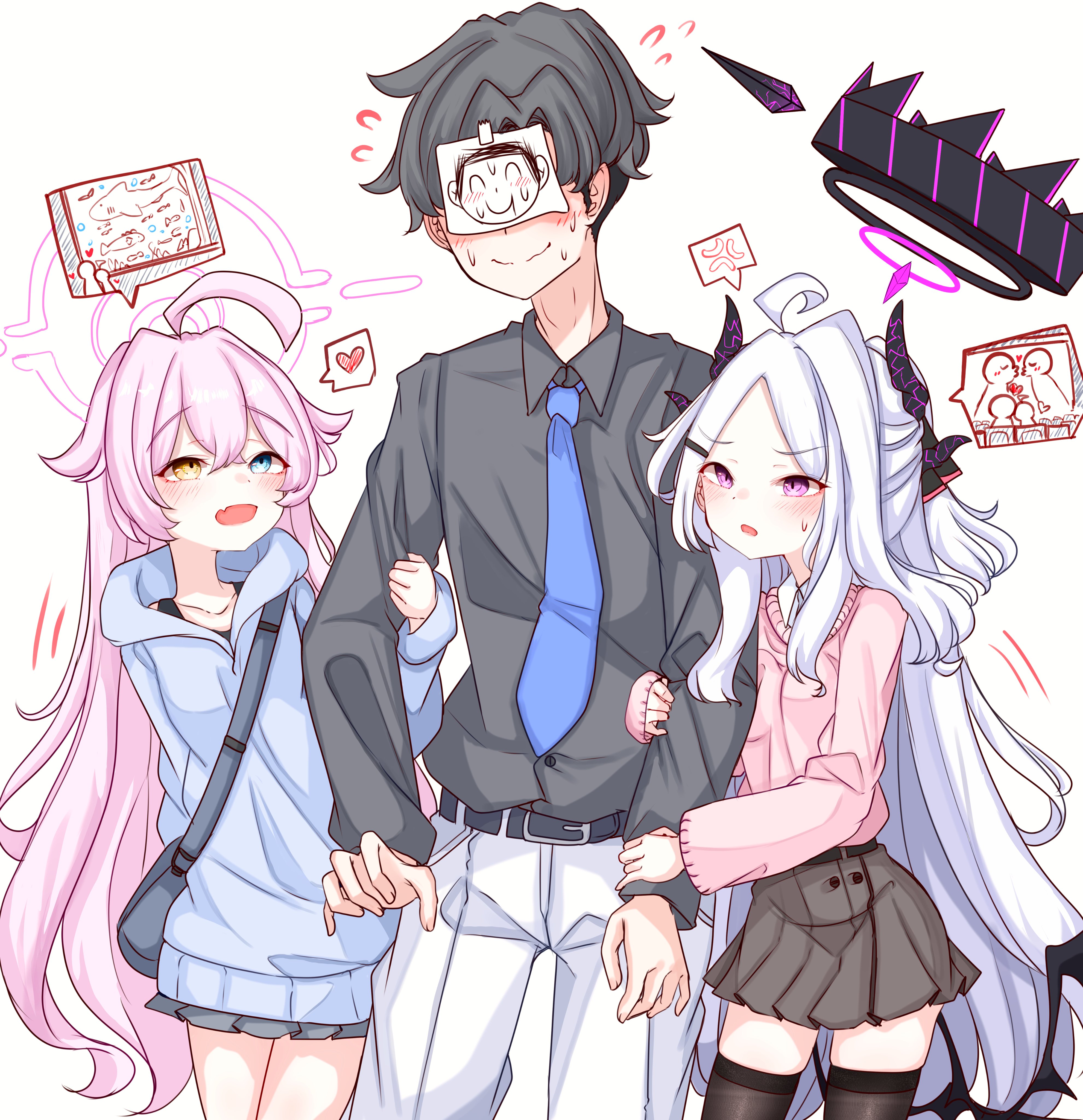kohane kun, yangyang (wuthering waves), wuthering waves, absurdres, check clothing, chinese commentary, clothing request, commentary request, highres, 1girl, alternate costume, ascot, black eyes, black hair, blue bow, blue dress, bow, breasts, day, dress, feather hair, from side, game screenshot background, hair bow, hand up, layered dress, long hair, looking afar, medium breasts, mole, mole under eye, screenshot background, solo, white ascot, white dress