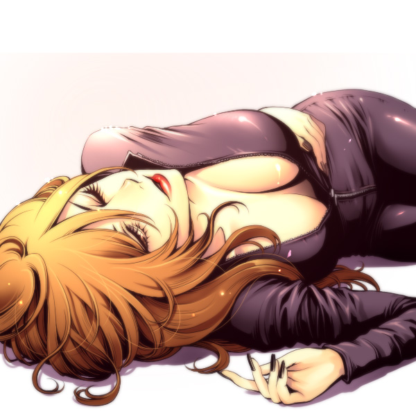 1girlblack nailsbodysuitbreastsbrown eyesbrown haircenter openingcleavageclosed eyesfemale focusfingernailslarge breastslatexlatex suitlipslipsticklong hairlyingmakeupnail (hardware)nail polishon sideone eye closedshiny clothesskin tightsolounconsciouswink