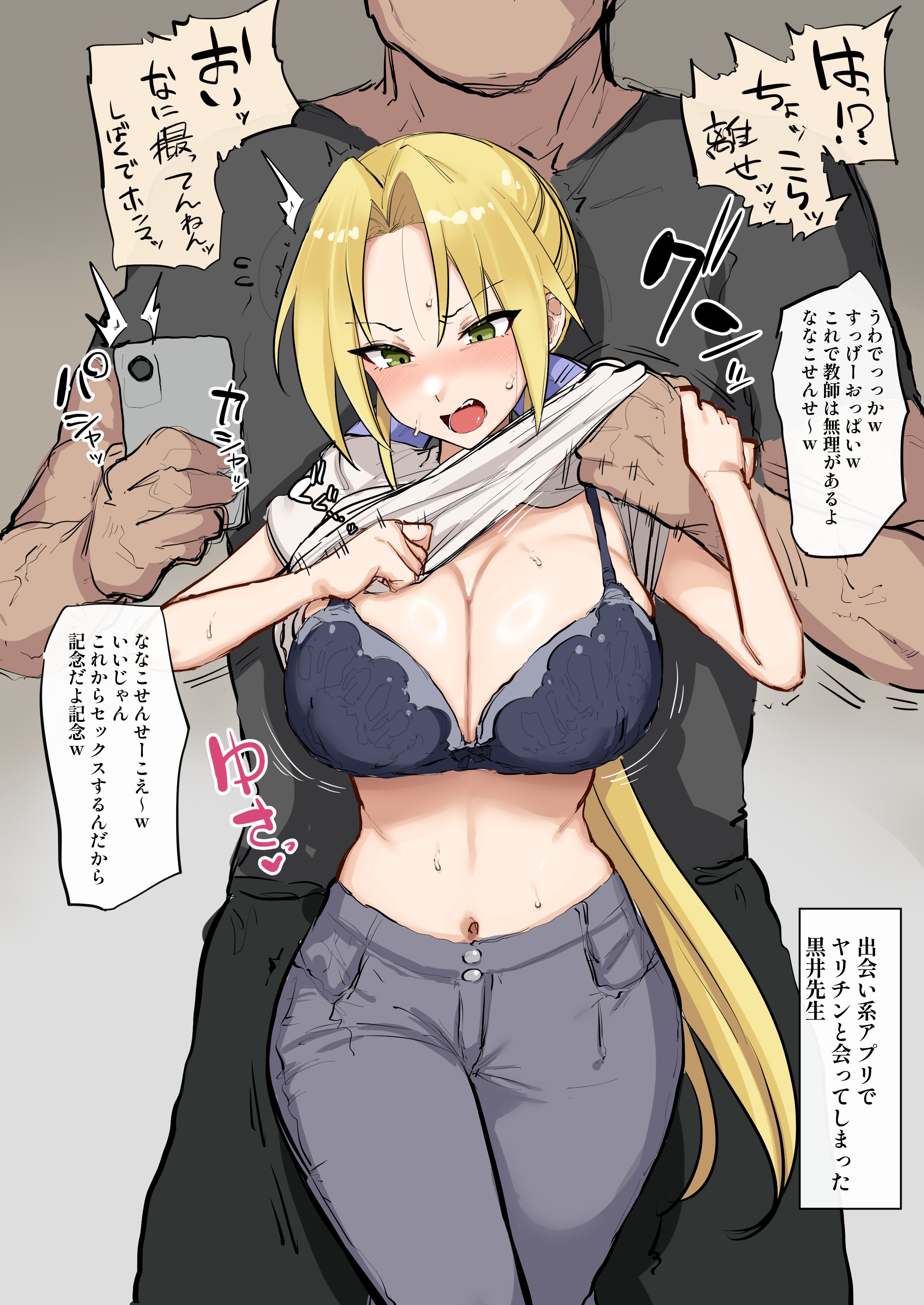 1boy1girlblack brablonde hairblue ribbonblushbrabreastscellphonecleavageclothes liftcurvyfacelessfaceless malegreen eyeshair ribbonholdingholding phonehuge breastsikura momenjapanese textlarge breastslong hairnavelopen mouthpantsparted bangsphoneribbonshirtshirt liftsmartphonespeech bubblestomachthighsunderwearwhite shirtwide hips