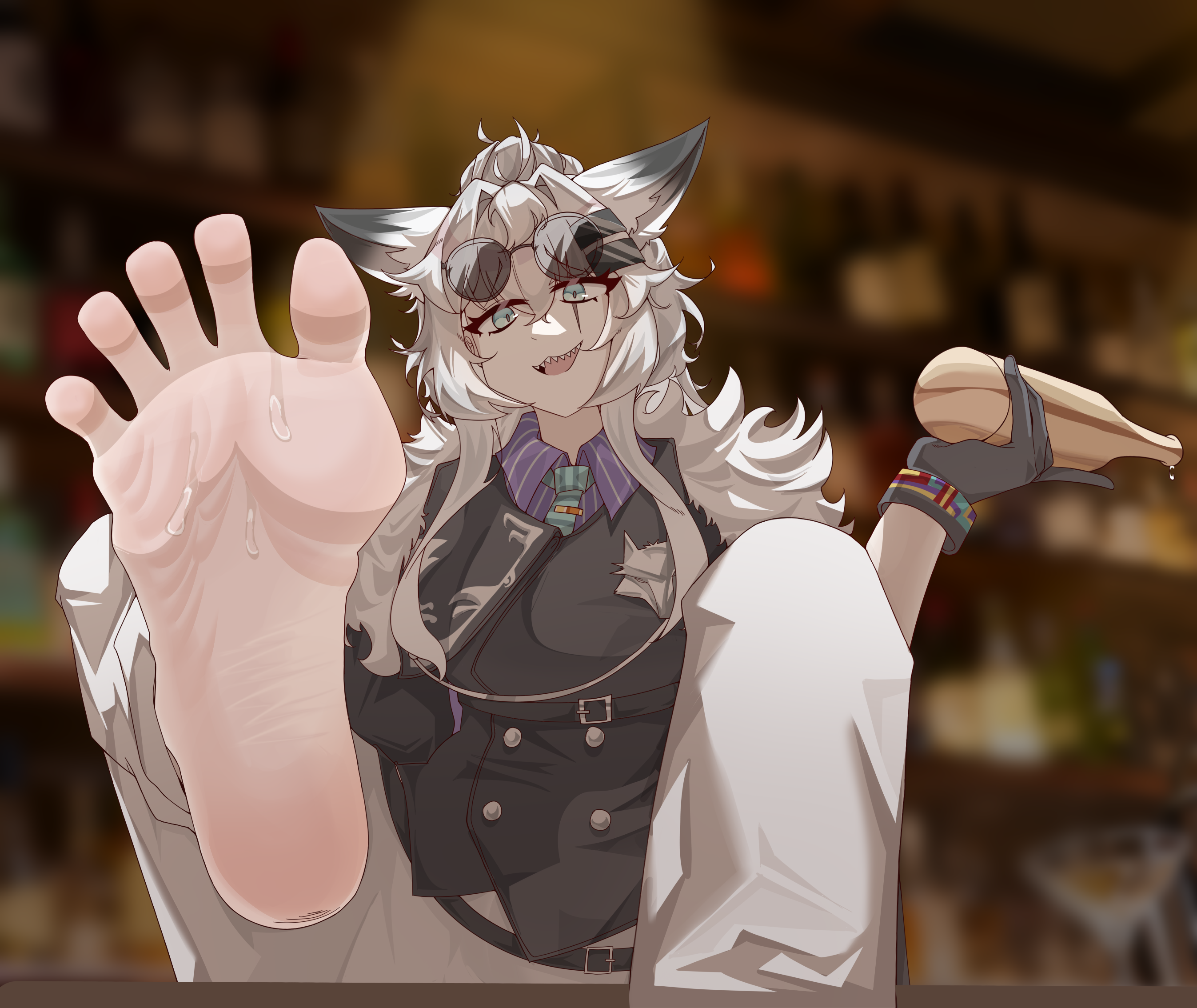 1girlanimal earsbarefootfeetlong hairlooking at vieweropen mouthsharp teethsolessunglasses on headsweatteethtoeswhite hair