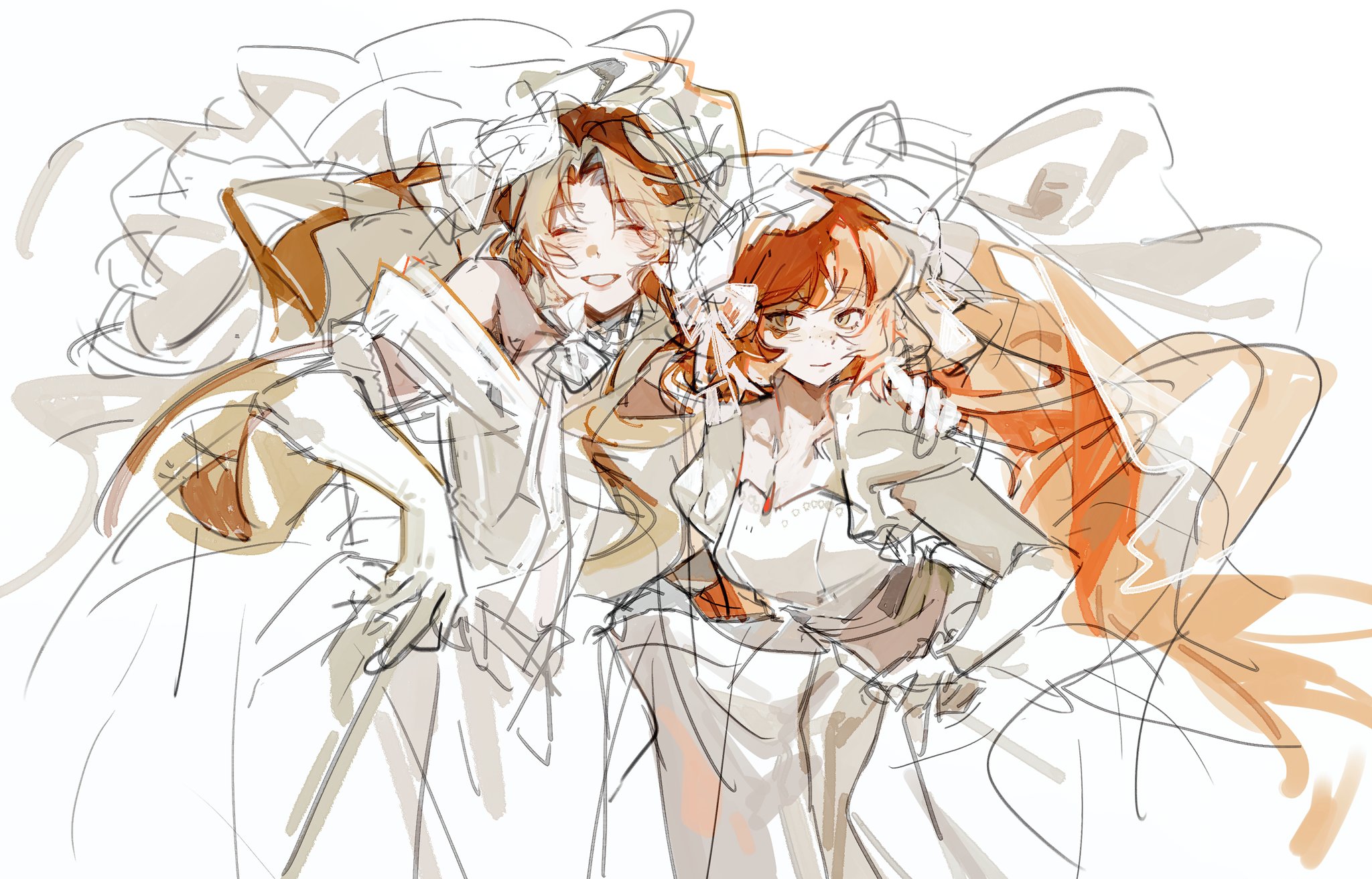 2girlsbowbowtiebridal veilbrown hairclosed mouthcowboy shotdressgloveshappyjewelryjuliet sleeveslong hairlong sleevesmultiple girlsnecklaceorange hairparted bangsparted lipspuffy sleevessimple backgroundsmileveilvery long hairwedding dresswhite backgroundwhite bowwhite bowtiewhite dresswhite gloveswhite veilwife and wifeyuri
