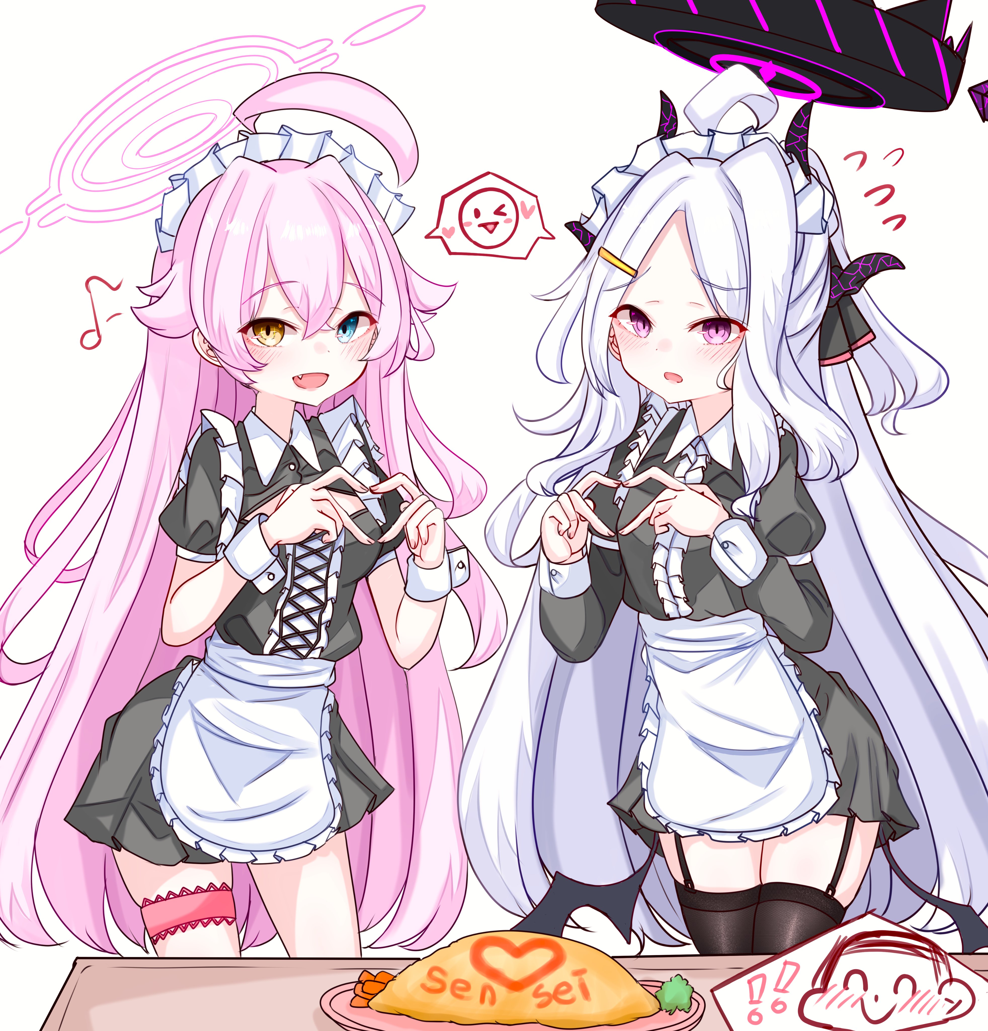 1boy2girlsahogeapronblack dressblack haloblack thighhighsblue eyesblushbreastsdemon hornsdemon wingsdressgarter strapshair between eyeshaloheartheart handshornslong hairlong sleeveslooking at viewerlove trianglemaid apronmaid headdressmultiple girlsopen mouthpink hairpink halopurple eyessmall breastsstandingthigh strapthighhighsthighsvery long hairwaist apronwhite apronwhite backgroundwhite hairwingsyellow eyes