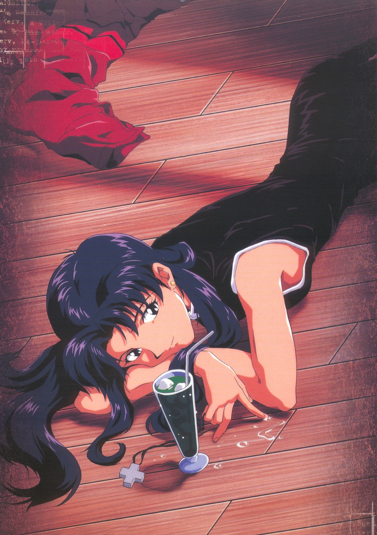 1girlbare armsbare shouldersblack dressblack eyesclosed mouthcrosscross necklacecupdressdrinkdrinking glassdrinking strawdutch angleearringsfemale focusgreek crossholdingholding jewelryholding necklacejewelrylong hairlooking at viewerlyingnecklaceon flooron stomachparted bangspurple hairsleevelesssleeveless dresssmilesolostud earringsunworn jewelryunworn necklacewooden floor
