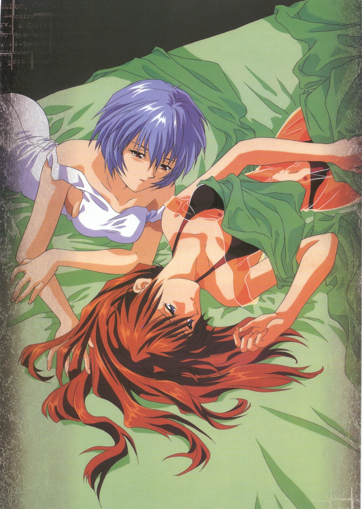 2girlsbedblue eyesblue haircurvyhair downlingerielong hairlyingmultiple girlsred eyesred hairshort hairthongunderwearwide hips