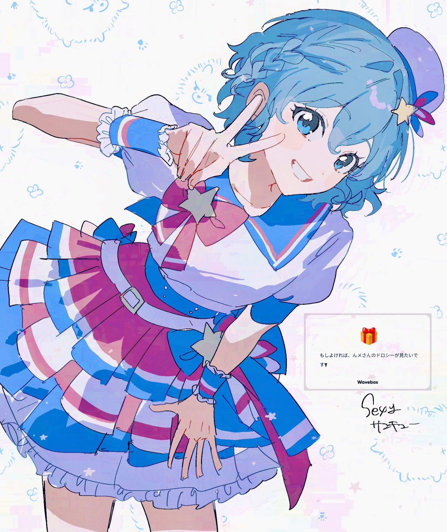 michii yuuki, arle nadja, carbuncle (puyopuyo), madou monogatari, puyopuyo, puyopuyo n, bad id, bad pixiv id, 1girl, aqua background, armor, armored dress, belt, blue skirt, blunt bangs, boots, brown hair, cape, dress, gradient background, navel, one eye closed, open mouth, shoulder pads, skirt, staff, yellow background, yellow eyes