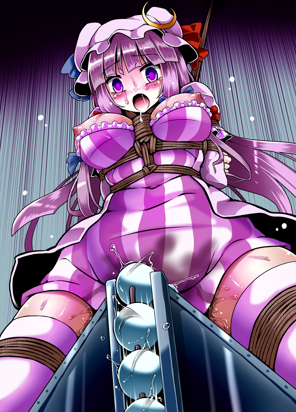 beadsbondagebreastscrescentfemaleFlag for Deletionhatlong hairnipplespurple eyespurple hairropesolotearsthighhighswooden horse