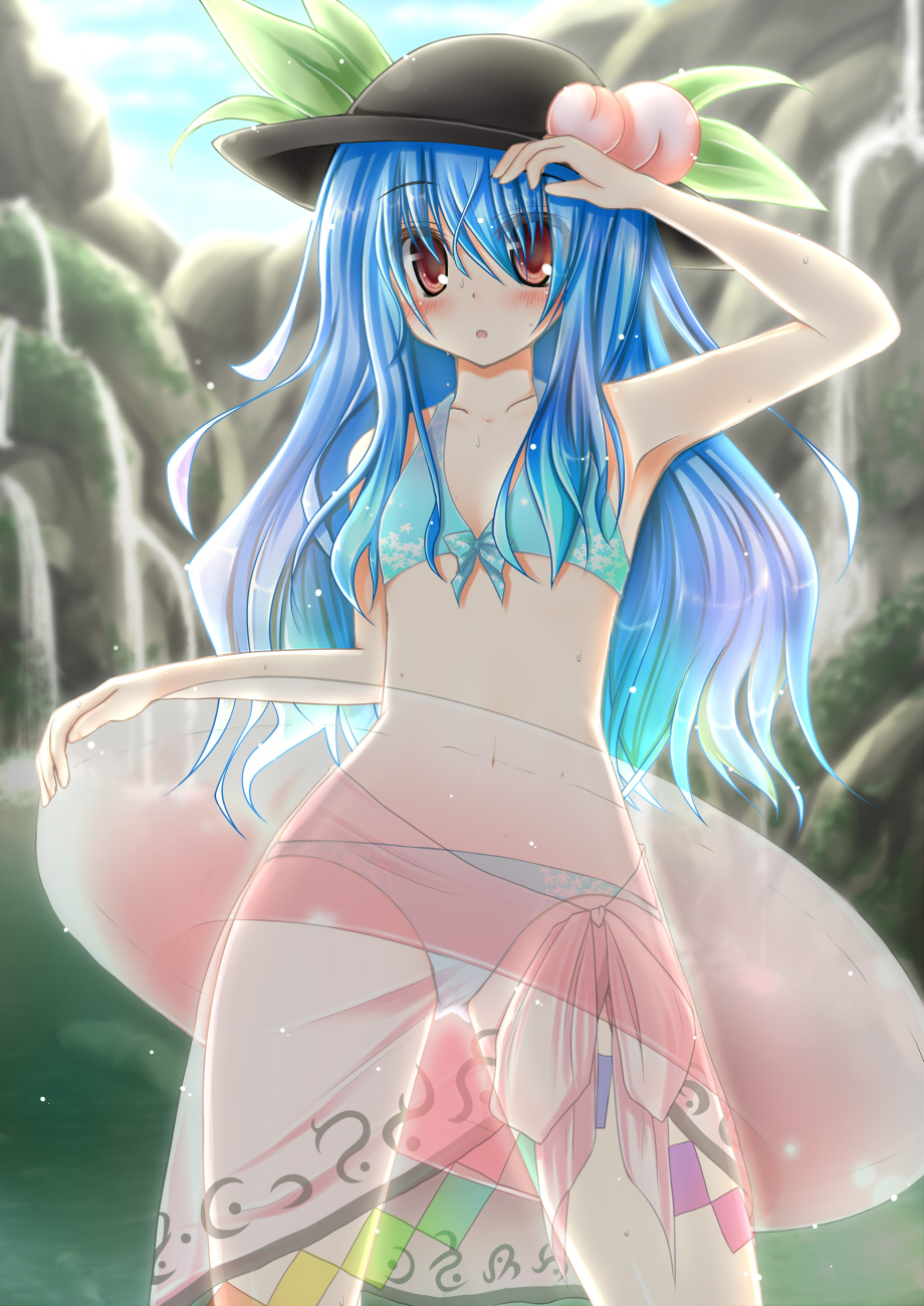 1girlbikiniblue bikiniblue hairblushdayfemale focusfoodfruithatinnertubepeachred eyessarongsee-through clothessee-through sarongsoloswim ringswimsuit