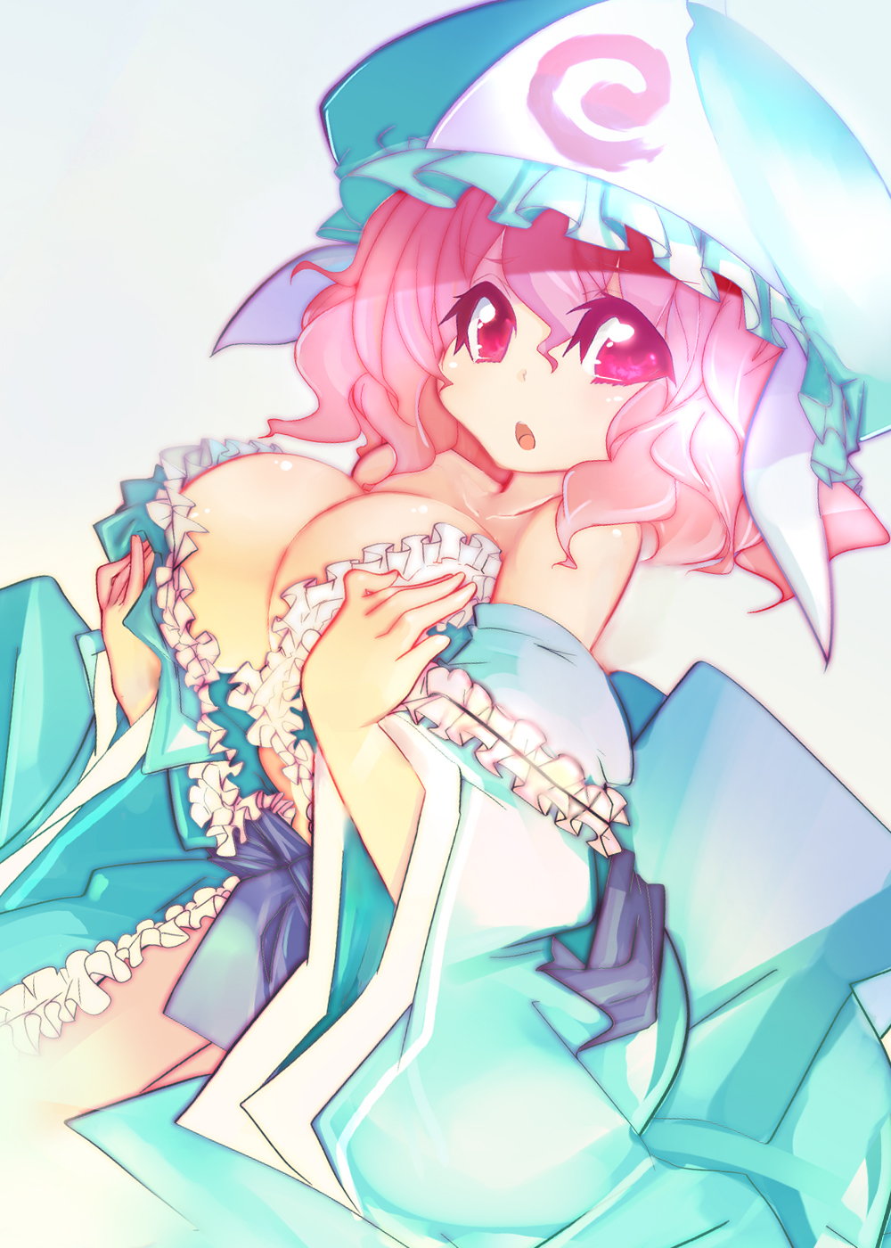 1girlbare shouldersbreast liftbreastscleavagecovering breastscovering privatesfemale focushatlarge breastsopen clothesopen mouthopen shirtpink hairred eyesshirtshort hairsolo
