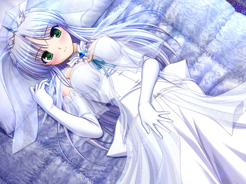 1girlbedblue hairblushbridal veilbridecrowndresselbow glovesfemale focusglovesgreen eyeslong hairlyingon backpillowsmilesolotiaraveilwedding dress