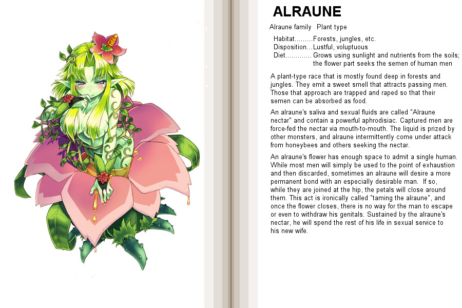 1girlblushbreastscharacter profilecolored skincomparisoncompletely nudeconvenient censoringenglish textflowergreen hairgreen skinlarge breastslong hairmonster girlnudeplantplant girlpointy earstopless female