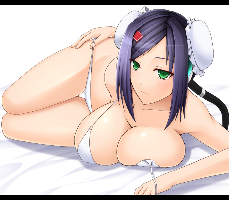 1girlbikiniblue hairbreast pressbreastsbun covercablecleavagedouble bunfemale focusfrowngreen eyeshair bunhair ornamenthaircliplarge breastslegsletterboxedlong hairlowleglowleg bikinilyingon sidepurple hairshort hairsolostrap slipswimsuitthigh gapthighsundressingwhite bikini