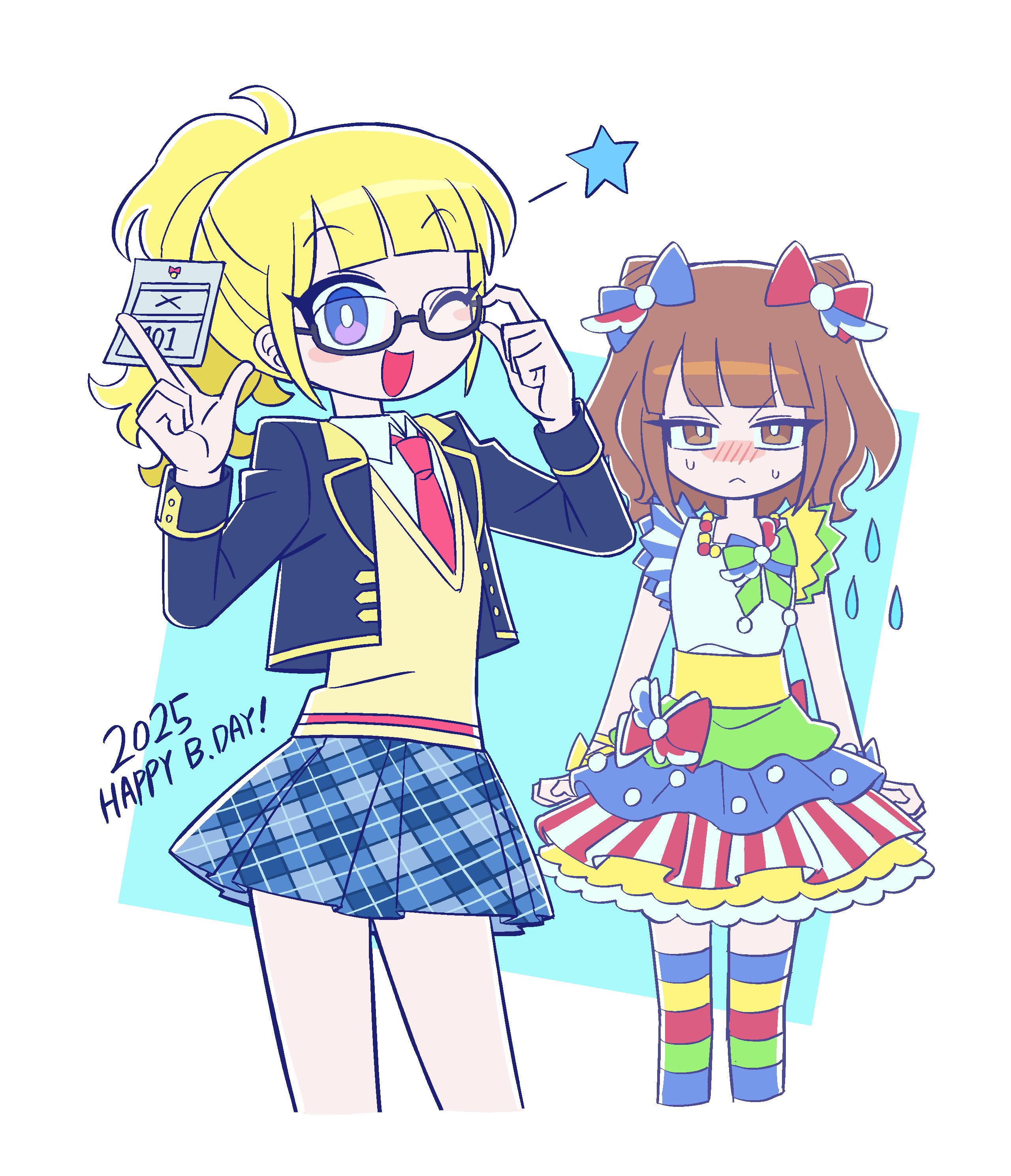 :d2025adjusting eyewearalternate hairstyleblonde hairblue bowblue eyesblue jacketblue skirtblunt bangsbowbright pupilsbrown haircollared shirtcone hair buncosplaycostume switchcropped jacketcropped legsdouble bundressglasseshair bowhair bunhairstyle switchhand on eyewearhands uphappy birthdayholdingholding paperidol clothesjacketjitomelong hairlong sleeveslooking at viewerminami mirei (cosplay)multicolored dressnecktieone eye closedopen mouthpaperpaprika private academy school uniformpink necktiepleated skirtponytailschool uniformself cosplaysemi-rimless eyewearshirtshort hairskirtsmilewhite pupilswhite shirt