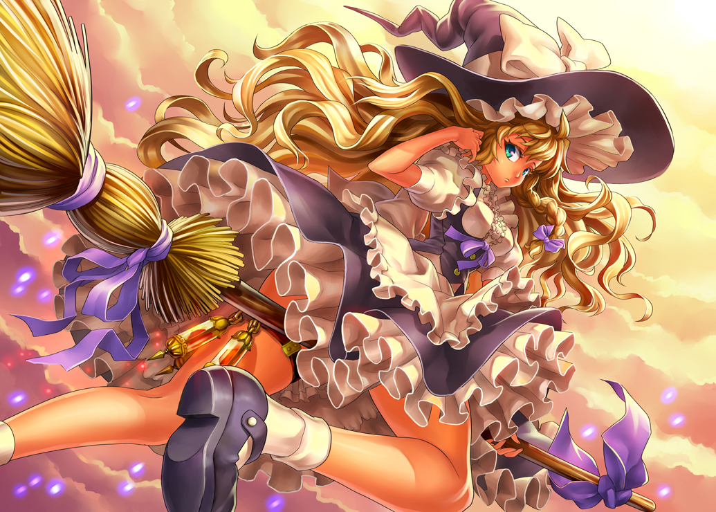1girladjusting hairaqua eyesblonde hairbraidbroombroom ridingclouddressdutch angleembellished costumefemale focusflyingforeshorteningfrillsfrom behindgathersglowinghatlegslight particleslong hairlooking backmary janesribbonshoesskysockssolosparklesunsetvery long hairwavy hairwitchwitch hat
