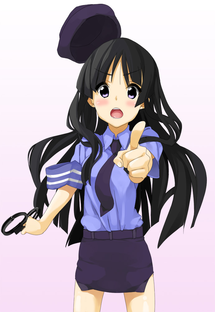 1girlarmbandblack eyesblack hairblue shirtblushcosplaycuffsfemale focusforeshorteninghandcuffshatlong hairminiskirtnecktieopen mouthpencil skirtpointingpolicepolice uniformpolicewomanpurple eyesshirtskirtsolounworn hatunworn headwear