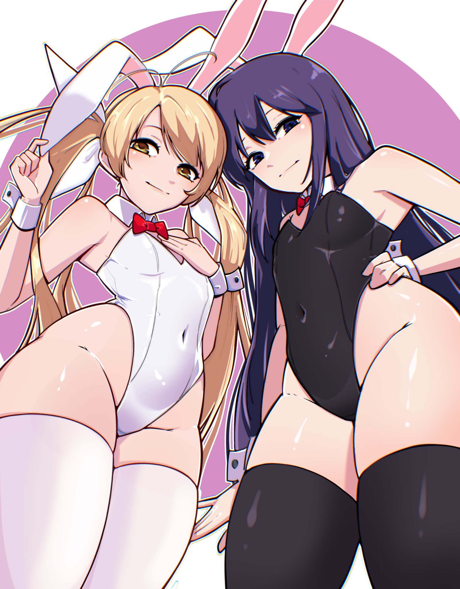 animal earsbare armsblack socksblonde hairbowbreastsflat chesthair bowhand on own chesthand on own hiplong hairplayboy bunnypurple eyespurple hairrabbit earsred bowsimple backgroundsmall breastssmirksmugsocksthighstwintailswhite socks