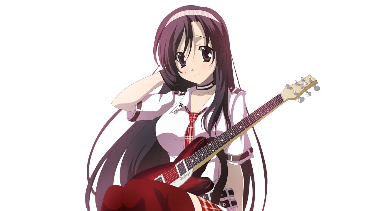00s1girladjusting hairchokerfemale focusguitarhairbandinstrumentlong hairnecktieplaid clothesplaid necktieplaid skirtpurple eyespurple hairred thighhighssittingskirtsmilesolothighhighs