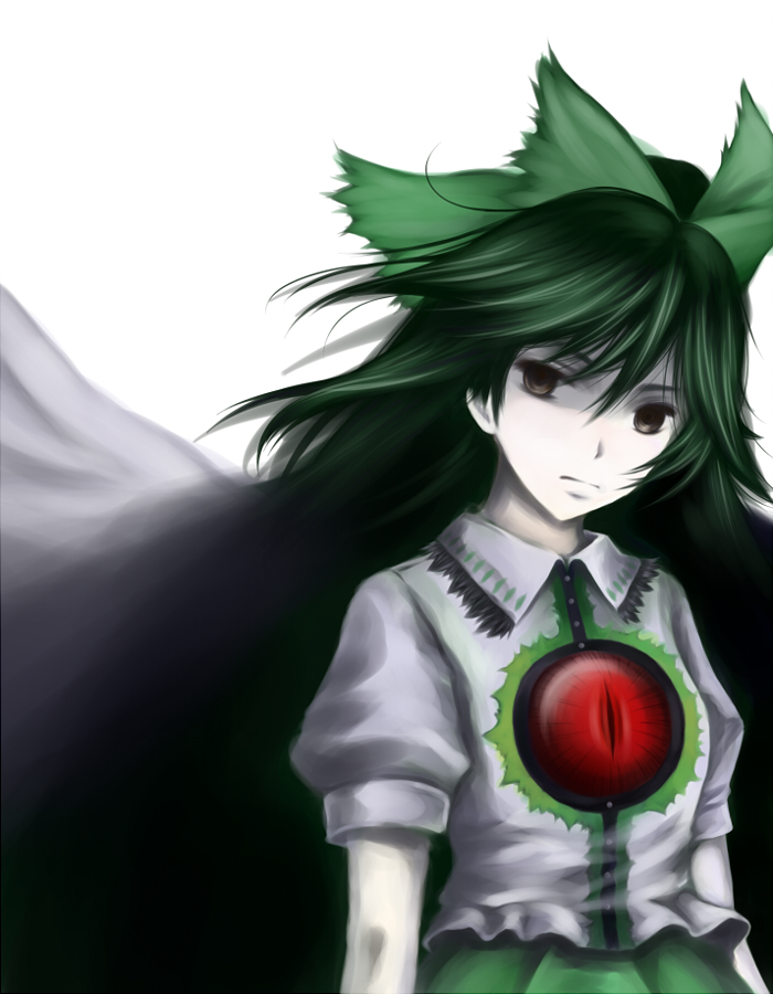 1girlblack hairbowbroochcowboy shotfemale focusgemgreen bowhair bowjewelrylong hairlooking at viewerponytailred eyessimple backgroundsolothird eyevery long hairwhite background