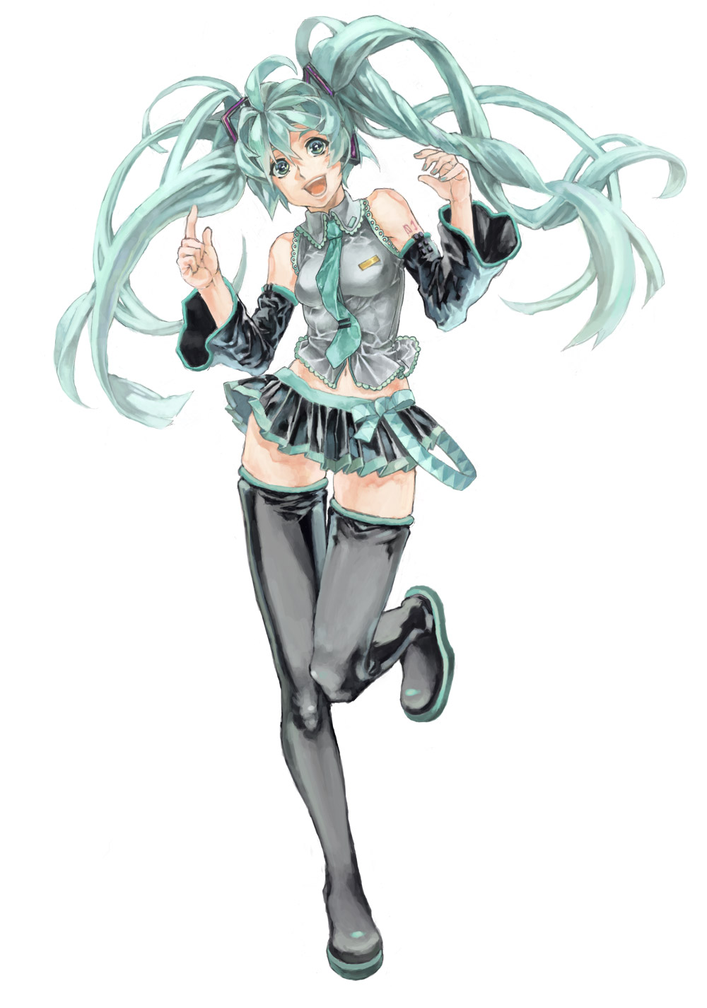 aqua eyesaqua hairdetached sleevesheadphoneslong hairmidriffnecktiesimple backgroundskirtsmilesolothighhighstwintailszettai ryouiki