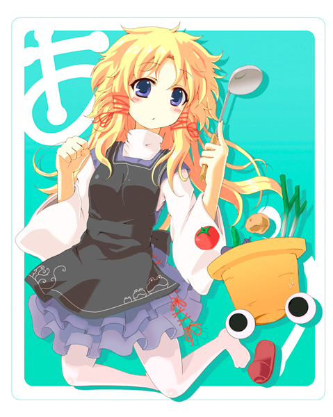 1girlapronaqua backgroundblonde hairblue eyesfemale focusfloatingfoodhatladlelong sleevespantyhosesolounworn hatunworn headwearvegetable