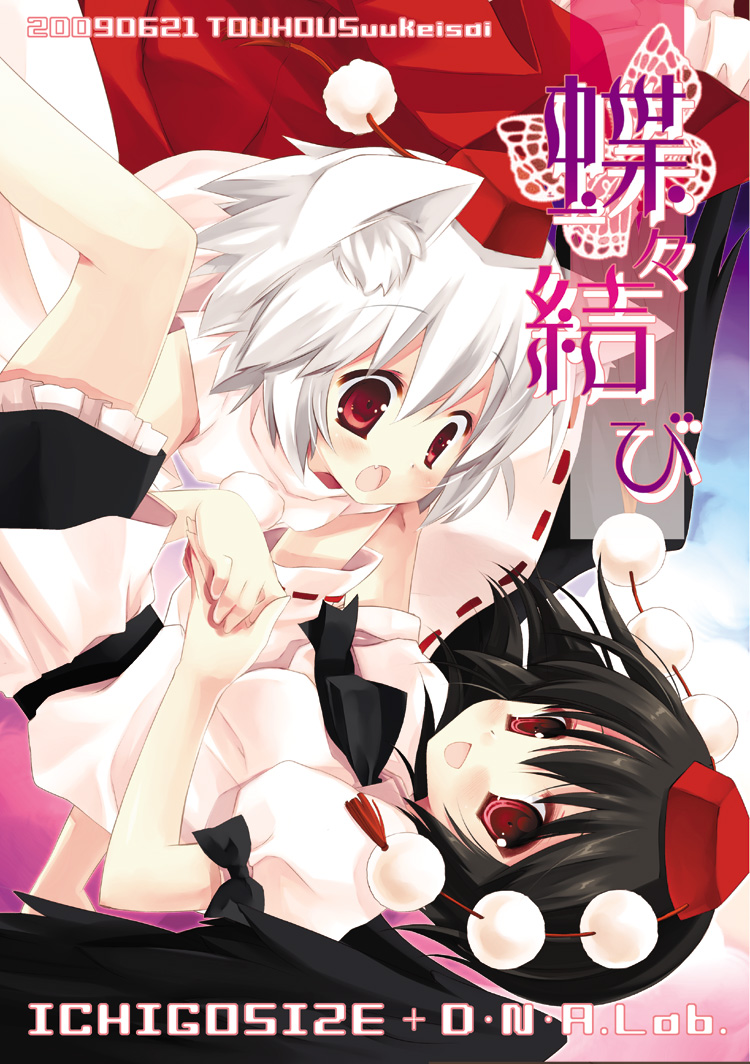 2girlsanimal earsblack hairblack wingsdetached sleevesfemale focushatmultiple girlsred eyesshort hairtokin hatwingswolf ears