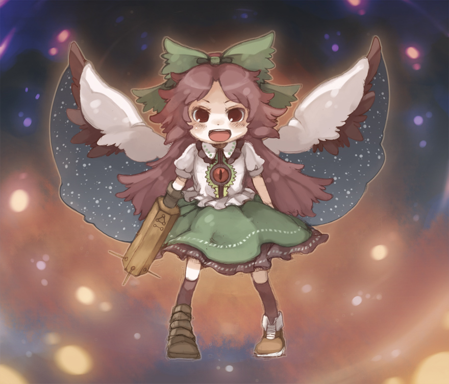 subaru (yachika), flandre scarlet, touhou, 1girl, :d, bobby socks, crystal, demon wings, dress, female focus, foreshortening, frills, full body, hat, mary janes, mob cap, open mouth, puffy short sleeves, puffy sleeves, red dress, red eyes, shoes, short sleeves, simple background, smile, socks, solo, white background, white socks, wings