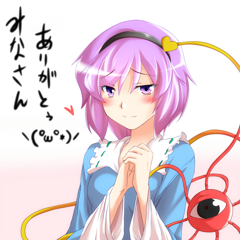 1girlblushfemale focusgradient backgroundhairbandheartown hands claspedown hands togetherpurple eyespurple hairshort hairsmilesolo