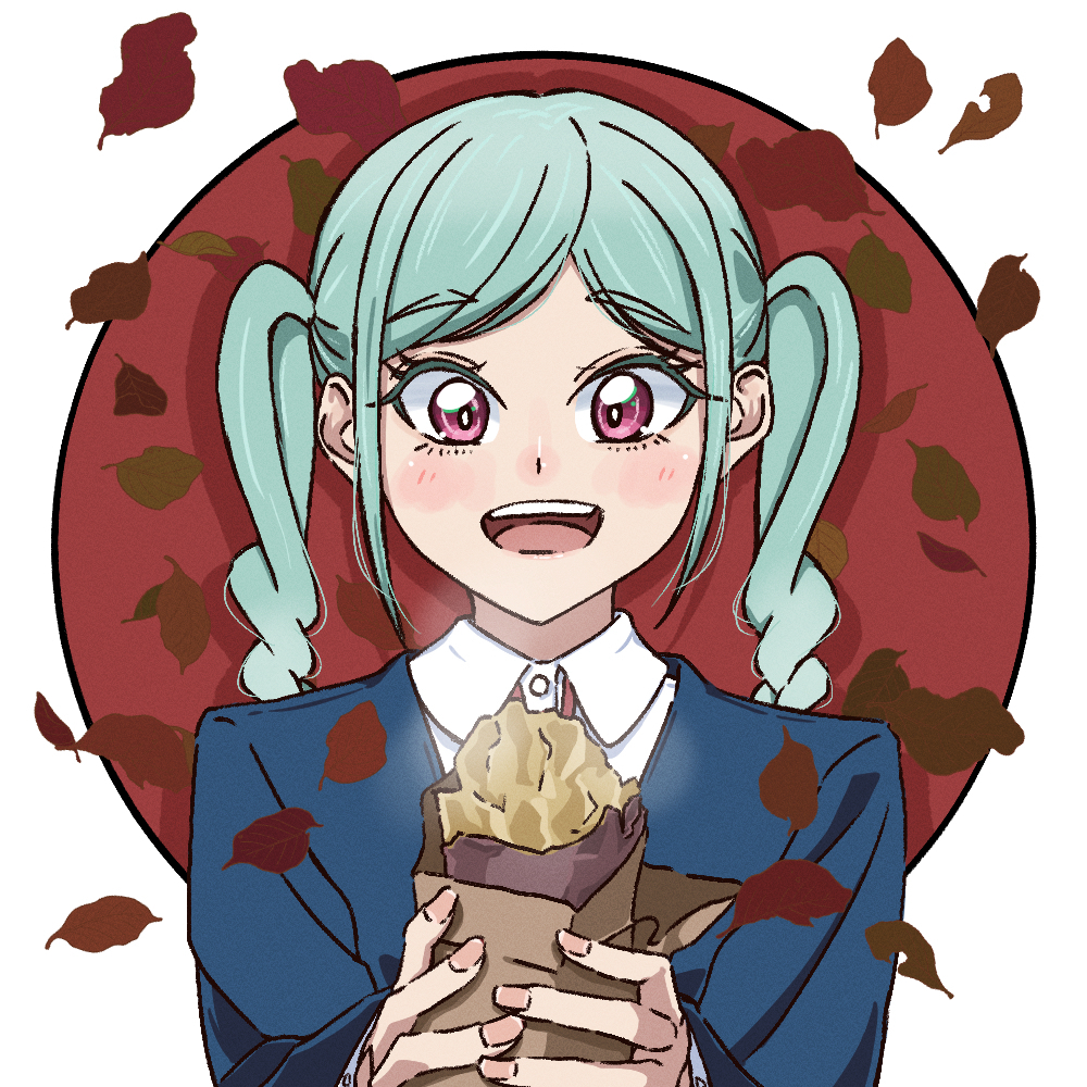 aqua hairautumnblue jacketblushbraidcirclecollared shirtdressfalling leavesfoodhands upholdingholding foodjacketleaflong sleeveslooking at foodmedium hairmeronjuice comneck ribbonopen mouthpink eyespink nailsportraitraised inner eyebrowsred backgroundred ribbonribbonroasted sweet potatoschool uniformshirtsidelockssmilesteamstraight-onsweet potatoteethtwin braidstwintailsupper teeth onlywhite backgroundwhite shirtwinter uniformyuigaoka school uniform