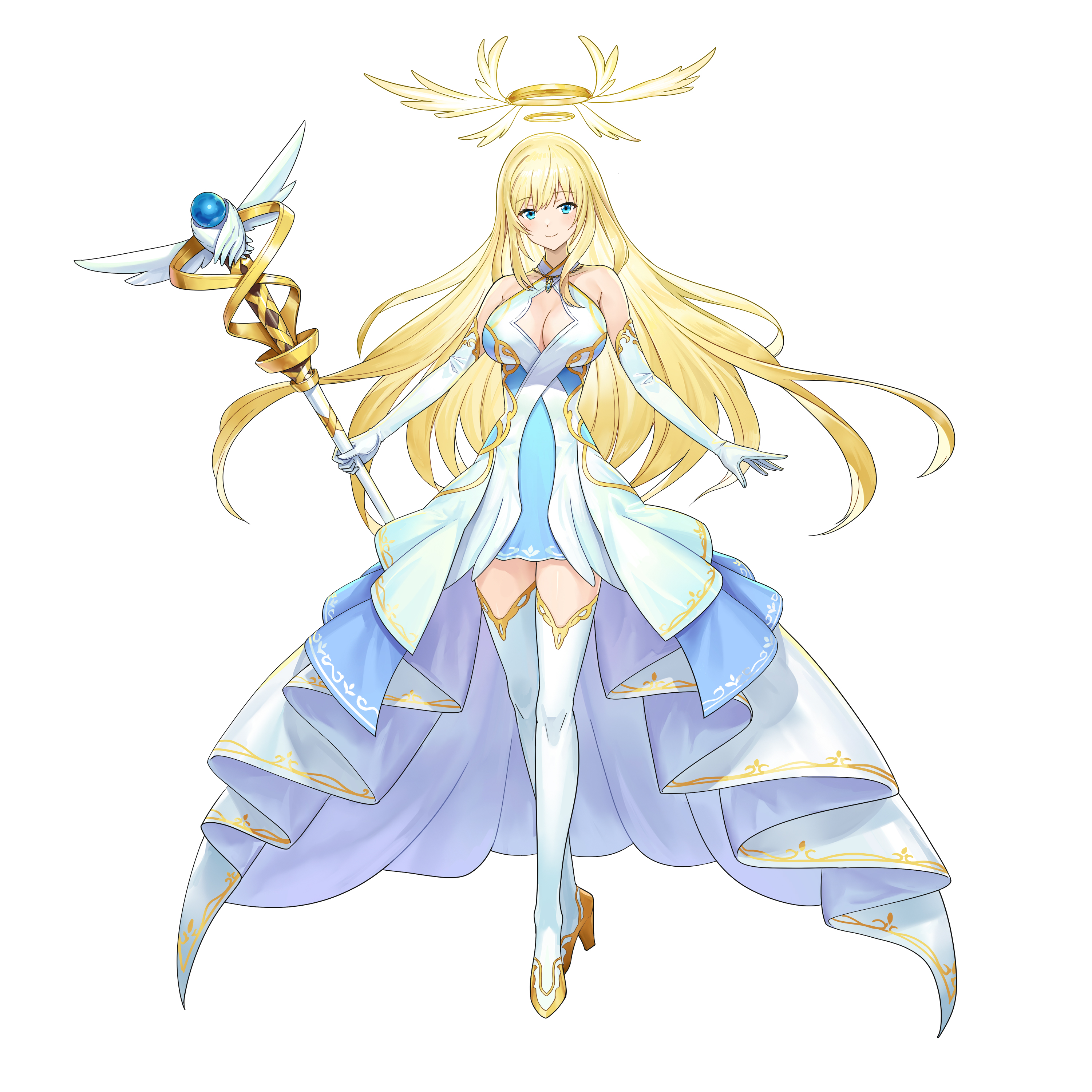 1girlblonde hairblue eyesbreastscrossed legsdresselbow glovesfull bodygloveshalohigh heelsholdingholding stafflarge breastslong hairlooking at viewershowgirl skirtsmilesolostaffstandingthighhighswatson crosswhite backgroundwhite dresswhite gloveswhite thighhighs