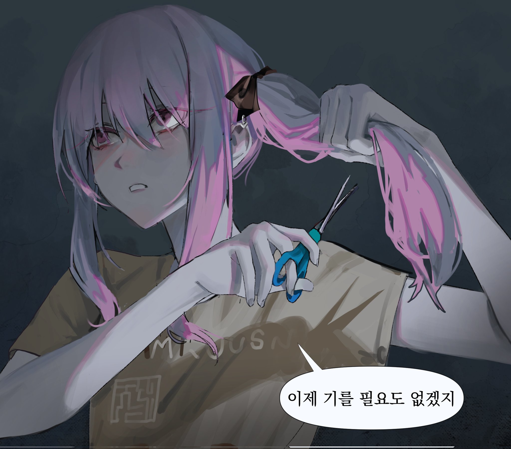 1otherblushbowbrown shirtclothes writingempty eyeseyelashesfingernailsgrey backgroundhair between eyeshair bowhands upholdingholding own hairholding scissorskorean textkoto6along hairlooking afarother focuspink eyespink hairred bowscissorsshirtshort sleevesside ponytailsidelockssimple backgroundsolospeech bubblet-shirtteethupper body