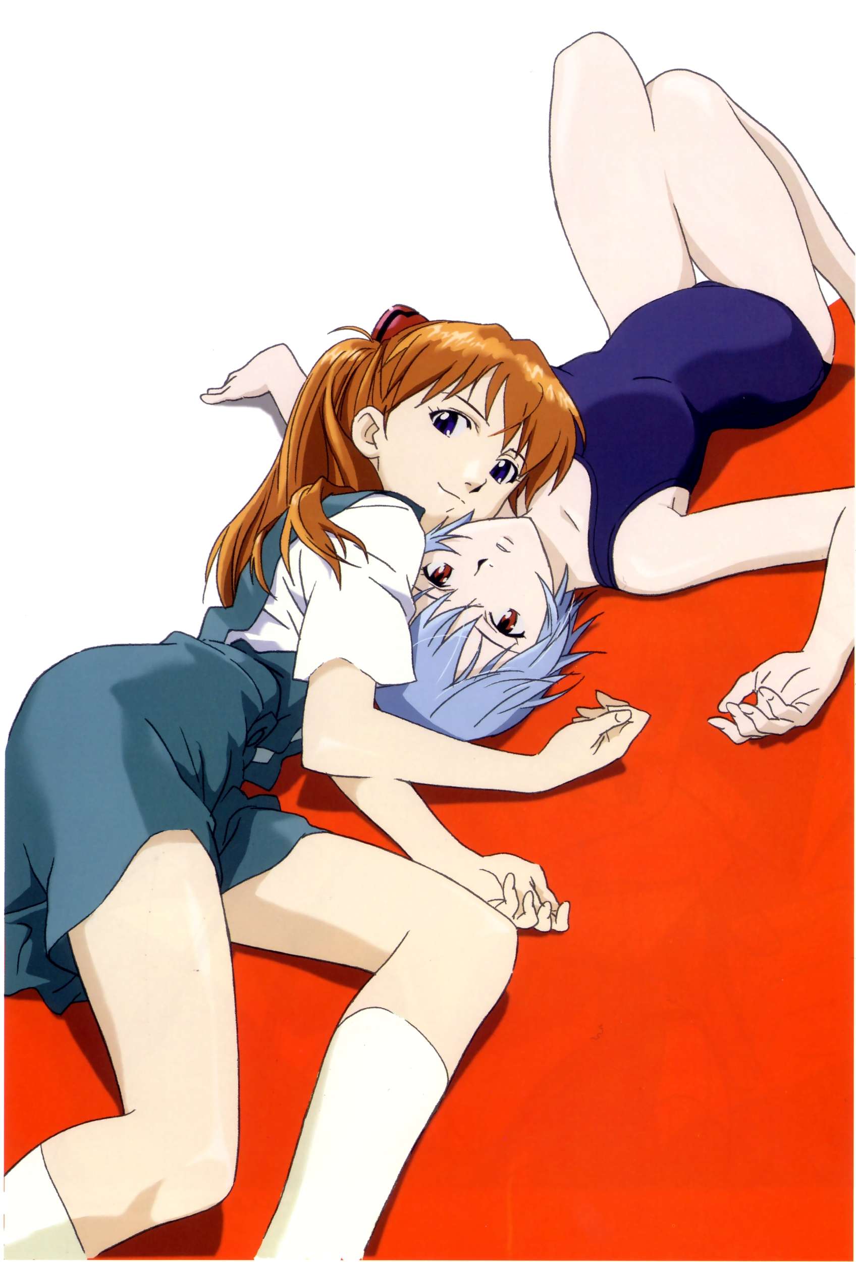2girlsblouseblue eyesblue hairblue one-piece swimsuitinterface headset (evangelion)kneehighslong hairlyingmultiple girlsone-piece swimsuitred backgroundred eyesred hairschool uniformshirtshort hairskirtsmilesocksswimsuittokyo-3 middle school uniformwhite backgroundwhite shirt