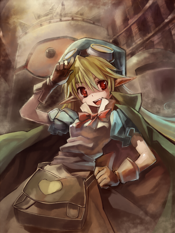 1girlbagblue hatbowbrown backgroundcapefemale focusgogglesgoggles on headhand on own hiphatpointy earsribbonsatchelsolovampire