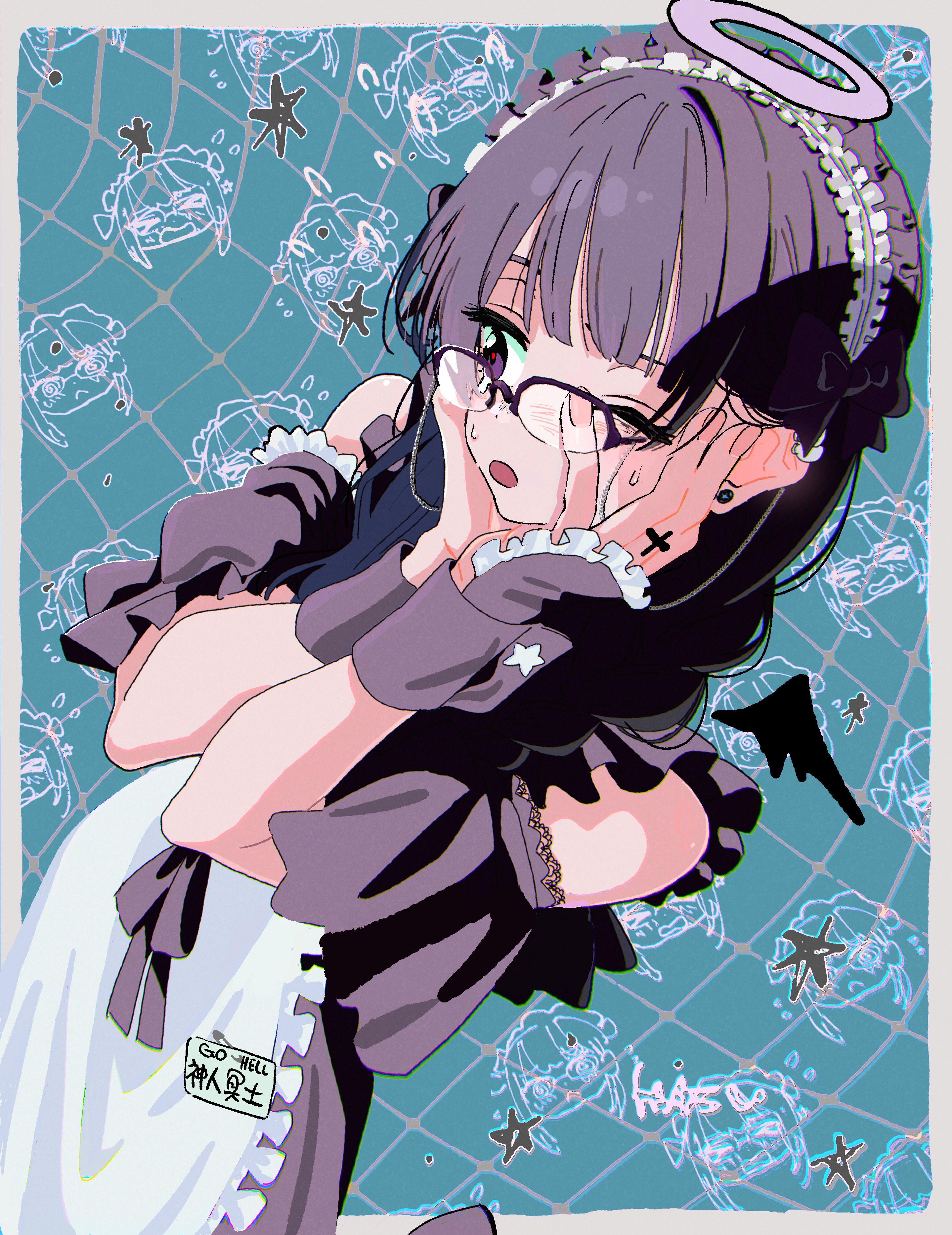 nantekottawo!!, gregor (project moon), meursault (project moon), rodion (project moon), limbus company, project moon, 1girl, 2boys, ahoge, aqua background, arthropod limbs, black hair, black sweater, blush stickers, brown hair, e.g.o (project moon), g corp. (identity) (project moon), gold trim, hair intakes, jacket, laurels, long hair, long sleeves, multiple boys, musical note, parted bangs, pursuance (e.g.o), quilted jacket, ribbed sweater, simple background, single blush sticker, sweater, very long hair, white jacket, yellow wings