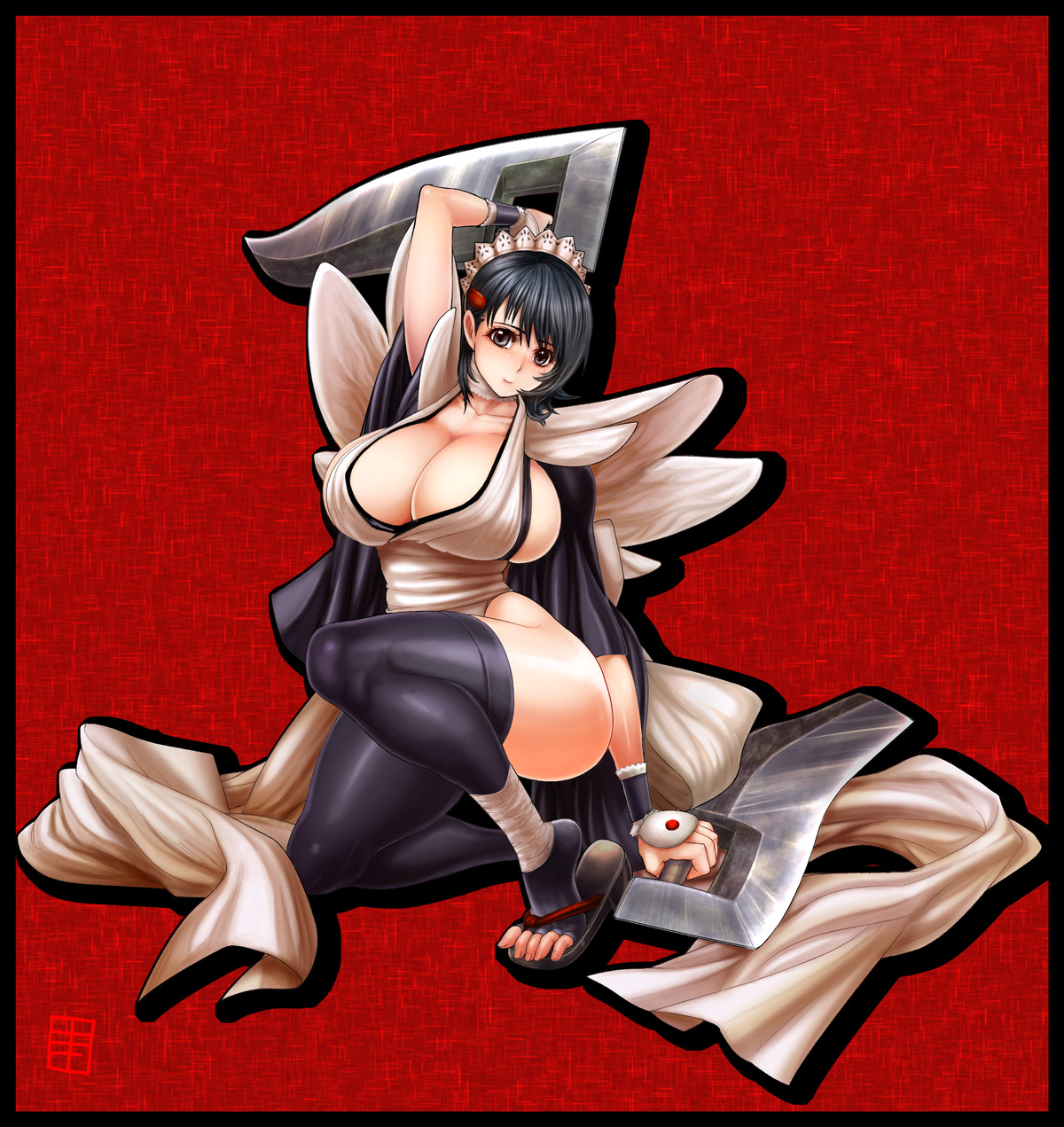 1girlarm upblack borderblack eyesblack hairborderbreastscleavagecurvyfemale focushair ornamenthuge breastslong toesmaidon one kneered backgroundsandalsshort hairsideboobsoloswordthick thighsthighhighsthighstoeless legweartoesweapon