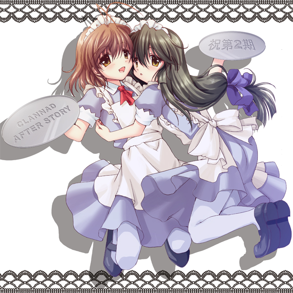 00s2girlsannouncement celebrationantenna hairhair ribbonhugmaidmaid headdressmultiple girlsopen mouthpantyhoseribbonshoestraywaitress