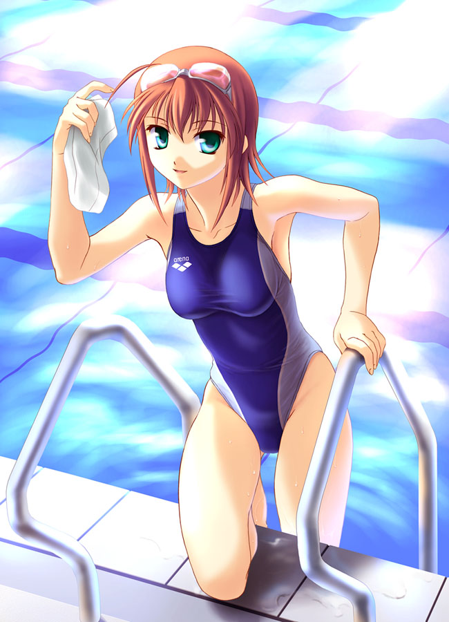 00s1girlcompetition swimsuitfemale focusgogglesgoggles on headgreen eyesone-piece swimsuitpoolpool ladderpoolsidered hairshort hairsoloswim capswimsuitwet