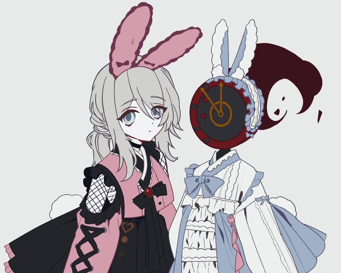 1girl1otheranimal ear hairbandanimal earsblack skirtchima (clothes)clockclothing cutoutfake animal earsfirefishnet topfishnetsflaming headfrilled hairbandfrilled skirtfrillshairbandhanbokkorean clotheslooking at viewerlow ponytailobject headpink hanbokponytailrabbit ear hairbandrabbit earsrodionlotteshoulder cutoutsimple backgroundskirtwhite backgroundwhite hairwhite hanbok