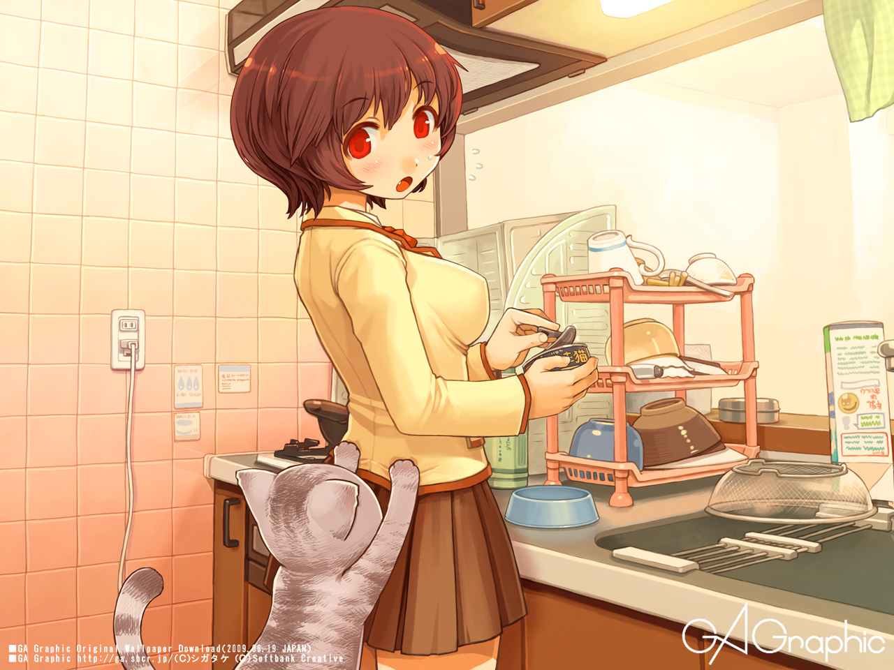 1girlblushbowlbrown haircatcupfangfemale focuskitchenlooking backopen mouthpet bowlpet foodpleated skirtred eyesschool uniformserafukushort hairskirtslice of lifesolosurprisedsweatdrop