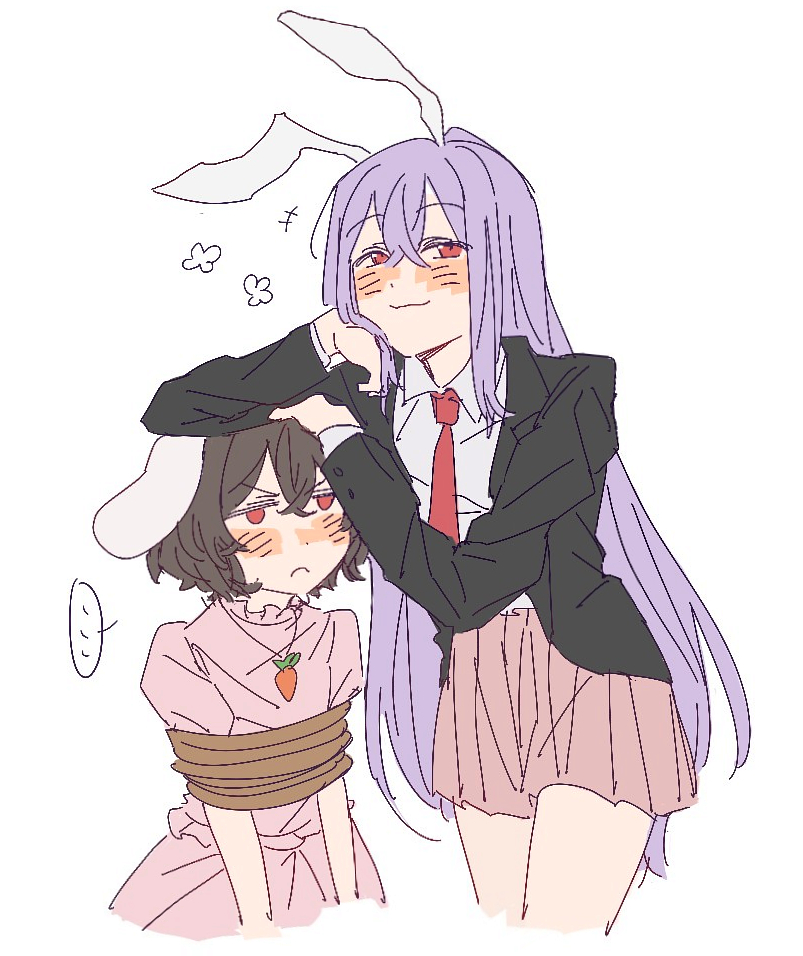 1boy2girlsan9 (jwns5327)animal earsblack jacketblushboundbound armsbrown haircarrot necklacedresselbow on another's headfrownhair between eyeshand on another's headjacketjewelrylong hairlong sleeveslooking at viewermedium hairmultiple girlsnecklacenecktiepink dresspink skirtpurple hairrabbit earsrabbit girlred eyesred necktieshirtshort sleevesskirtsmilethighsvery long hairwhite shirt
