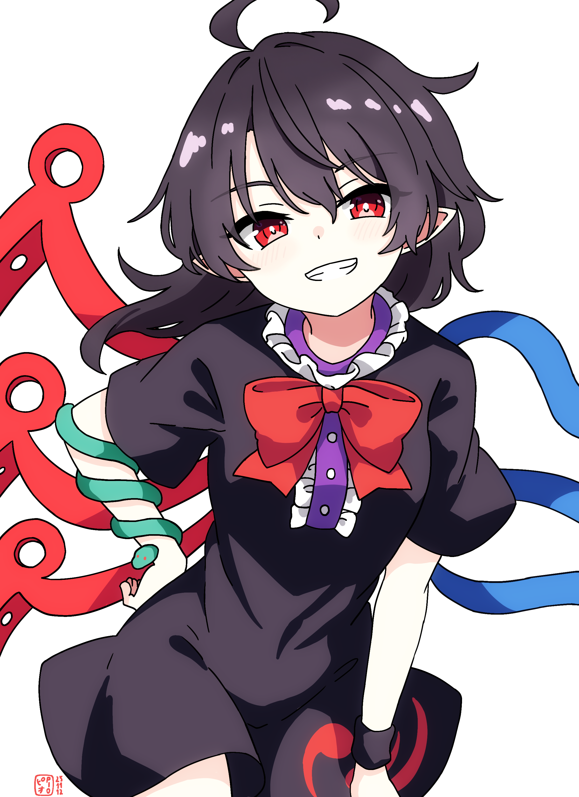 higashikata joshu, hirose yasuho, jojo no kimyou na bouken, jojolion, commentary request, highres, 1boy, 1girl, anger vein, arrow print, black bow, black bowtie, black hair, black pants, black skirt, blunt bangs, bow, bowtie, cheek-to-cheek, chibi, chibi only, closed eyes, flower ornament, flying sweatdrops, green lips, hair bobbles, hair ornament, heads together, heart, heart background, kiss, kissing cheek, o3o, open mouth, pants, puckered lips, purple hair, shaded face, shirt, short sleeves, sitting, skirt, souzou bunni, undercut, wristband, yellow shirt