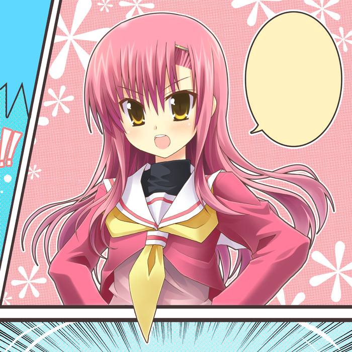 00sblank speech bubbleblushcomichairbandlong hairpink hairschool uniformserafukusolospeech bubbleyellow eyes