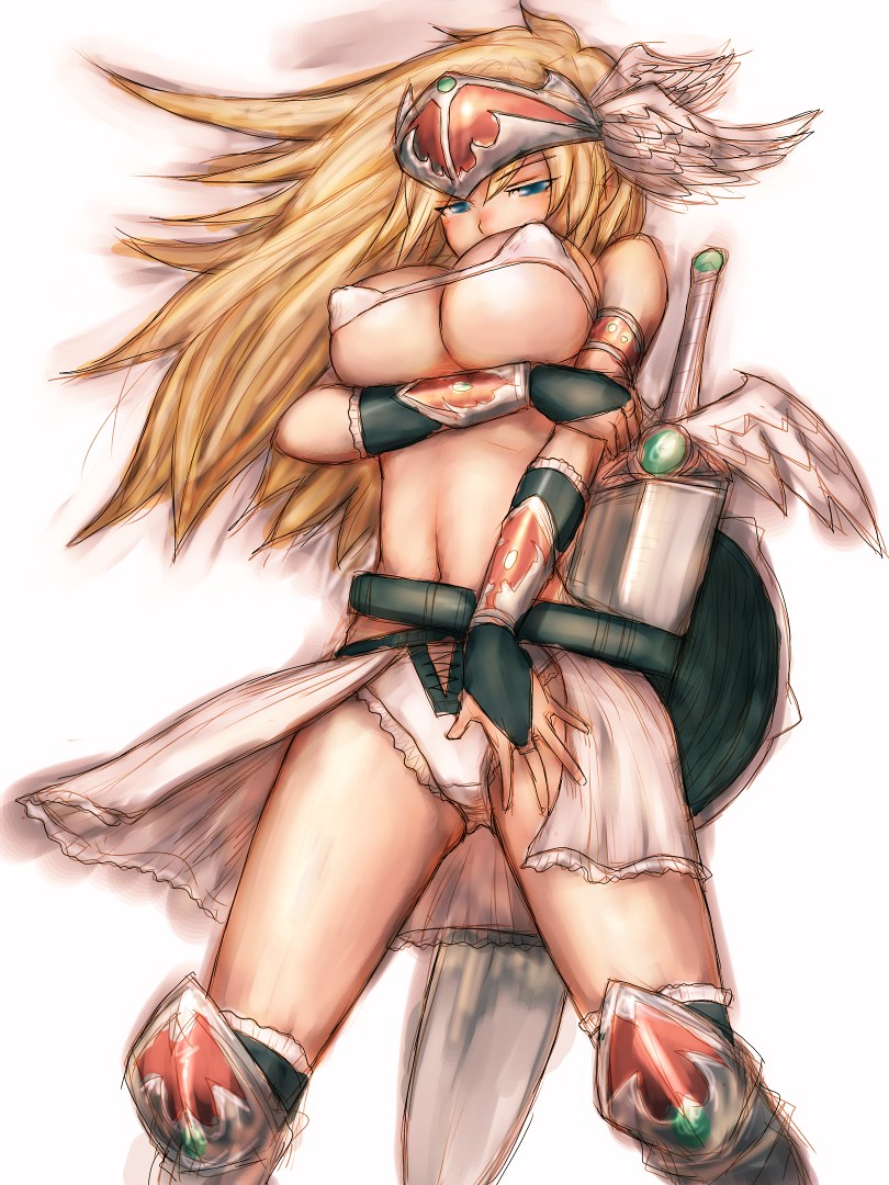1girlarmorbikinibikini top onlyblonde hairblue eyesbreast liftbreastsbridal gauntletscovered erect nipplesfemale focushead wingshelmhelmetlarge breastslong hairshieldsoloswimsuitswordunderboobvalkyrieweaponwings